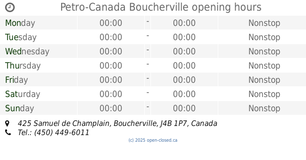 It is also possible to : Edit these OPENING HOURS of Station Petro-Canada In Boucherville, 425 Samuel de Champlain,